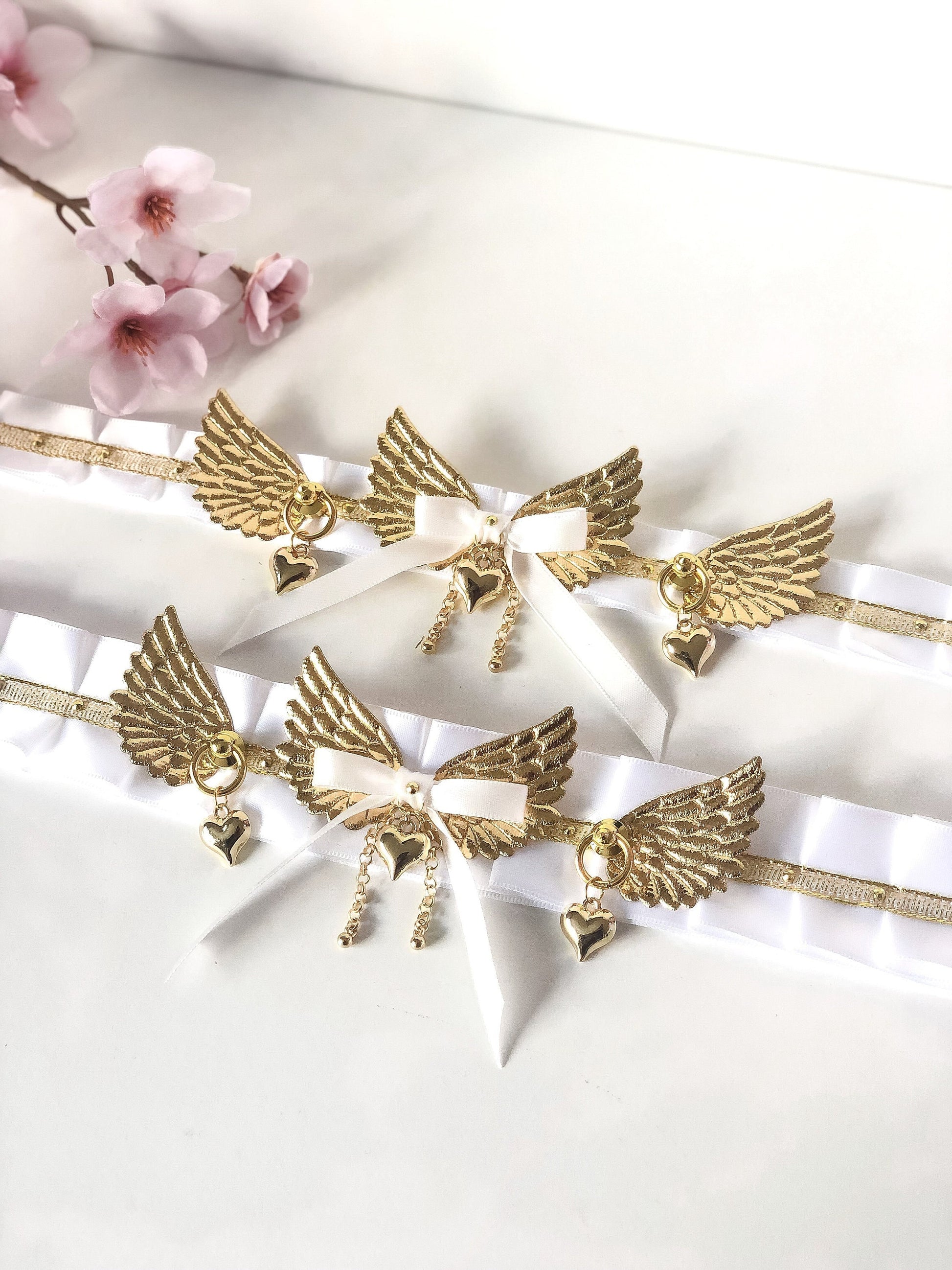 ♡ Collar details: 38mm and 25mm collar available, Satin ribbon material, Gold hardware, D-ring ribbon tie closure, faux leather gold wings, gold heart pendants, gold rhinestones, not designed for tugging or leash attachments