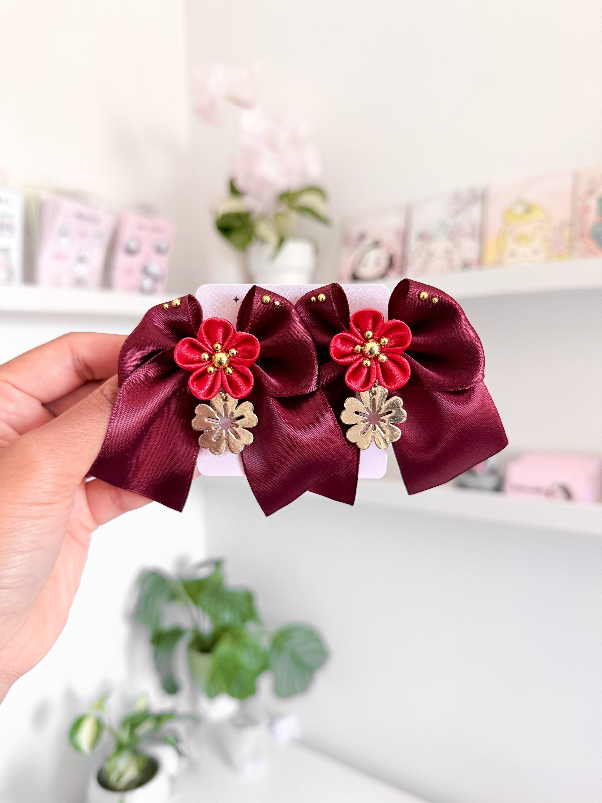 ♡ Features: gold hardware, handmade floral petals, gold sakura flower charm