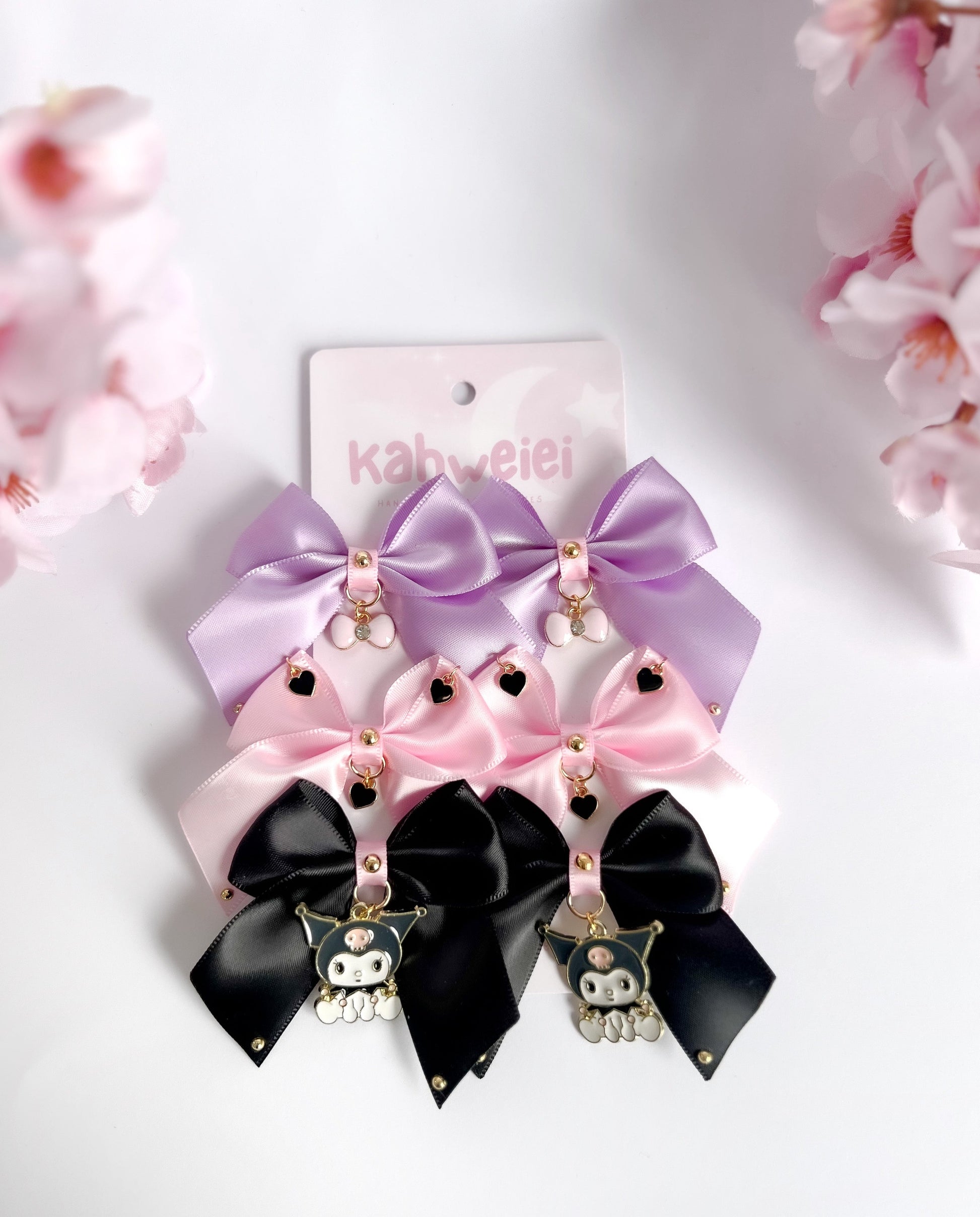 ♡ Pink bow, small black heart and kuromi charms